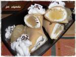 Naleśniki toffi z pomelo 249męża :) Naleśniki toffi z pomelo 14 naleśników o średnicy 22 cm Ciasto: 2 szklanki mąki pszennej 2 i 1/3 szklanki mleka + ewentualnie odrobina do uzyskania odpowiedniej gęstości szczypta soli 2 jajka budyń o smaku toffi bez cukru odrobina oleju do smażenia Nadzienie: 50 dag twarogu półtłustego 5 łyżek płynnego miodu kilka cząstek pomelo posypka czekoladowa Dodatkowo: bita śmietana(...)sprayu Naleśniki toffi z pomelo Żółtka oddzieliłam od białek. Mąkę przesiałam do miski, dodałam szczyptę soli, proszek budyniowy, żółtka i mleko. Całość dokładnie zmiksowałam i odstawiłam ciasto na 15 minut. Twaróg utarłam z miodem na gładką, puszystą masę. Białka ubiłam na sztywną pianę i dodałam do ciasta. Delikatnie wymieszałam łyżką. Ciasto powinno mieć taką konsystencję, że by dość swobodnie rozpływać