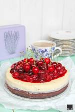 Sernik nowojorski z czereśniami 290zdecydowanie mój ulubiony sposób na sernik. Głównie dlatego, że nie jest on tak ciężki i intensywny jak nasz rodzimy. Efekt aksamitnej struktury otrzymujemy głównie przez dobrze zmielony tłusty twaróg (w oryginale ser Philadelphia lub serek wiejski) i pieczenie w kąpieli wodnej, która daje wspaniałe rezultaty. Oczywiście sos czereśniowy (jak i kakaowy spód) to pewna wariacja na temat klasycznego New York(...)wysokość ⅓ wysokości tortownicy. (Ciasta z pewnością trochę zostanie). Ciasto ponakłuwaj widelcem, a formę schłodź przez 30 minut w lodówce. Następnie piecz przez 20 minut w piekarniku nagrzanym do 180 °C. Spód po upieczeniu odstaw do wystudzenia, a piekarnika nie wyłączaj. Masa serowa: 800 g tłustego twarogu 200 g kwaśnej śmietany 18% 3/4 szklanki cukru 3 całe jajka