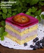 jagodowe ciastko 217nadziewanych i obowiązkową galaretką. Gratka zwłaszcza dla małych łasuchów, które jak wiadomo uwielbiają kolorowe ciasta i galaretki. *foremka 24*24 cm Składniki: biszkopt: 4 jajka 1 szklanka cukru 1 szklanka mąki 1 łyżeczka proszku do pieczenia na masę jagodową: szklana jagód 500 g twarogu półtłustego 300 ml kremówki 5 łyżek cukru pudru 2 łyżki żelatyny dodatkowo: 1/2 szklanki posłodzonej