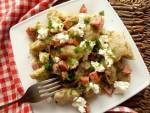 Kluski ziemniaczane 190jajka sól 50 dag dobrej wędzonej kiełbasy 1 duża cebula 25 dag twarogu 4 łyżki posiekanej natki pietruszki tłuszcz do smażenia Sposób przygotowania: Ziemniaki ścieramy na tarce na drobnych oczkach. Odciskamy na sitku z nadmiaru wody. Dodajemy jajka, mąkę i szczyptę soli. zagniatamy ciasto. Formujemy podłużny wałek. Wykładamy na deskę. Za pomocą noża odcinamy podłużne kluseczki. Gotujemy