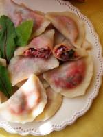 Pierogi z botwinką 206bomba, wszak nie zawsze mam nastrój by iść na zatłoczony targ... ;-) Ciasto: 250ml gorącej wody 400-500g mąki pszennej, u mnie typ 00 od Cabas.pl 1/2 łyżeczki soli Farsz: 500g młodych ziemniaków 2 duże cebule 1 pęczek botwiny 1 pęczek świeżego szpinaku (około 400g) 250g białego twarogu półtłustego sól, pieprz olej 1. Ziemniaki obieramy, gotujemy do miękkości(...)liście zmniejszą objętość a woda wyparuje. Studzimy. 3. Ziemniaki i twaróg przeciskamy przez praskę. Mieszamy z cebulą, botwiną i szpinakiem. Doprawiamy solą i obficie pieprzem. 4. Do miski dodajemy szklankę mąki i sól, mieszamy. Wlewamy gorącą wodę (powinna parzyć), mieszamy za pomocą drewnianej łyżki. Stopniowo dodajemy pozostałą mąkę ugniatając ciasto do momentu aż przestanie się kleić. Czasami potrzeba mniej niż