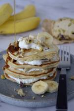 Pancakesy bananowo-chałwowe 48składniki – mąkę, proszek do pieczenia i dokładnie mieszamy do połączenia. Do białka dodajemy szczyptę soli i ubijamy mikserem na puszystą pianę. Dodajemy ją w dwóch partiach do ciasta na pancaksy i delikatnie mieszamy do połączenia. Rozgrzewamy teflonową patelnie, wlewamy porcję ciasta i zmniejszamy ogień na średni, ponieważ w pancakesach jest dużo cukru i nie chcemy aby się