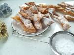 Faworki 156mąka) ok.1/2-3/4 szklanki szczypta soli łyżeczka octu lub spirytusu Mąkę przesiać na stolnicę,dodać resztę składników.Cisto zagniatać do otrzymania gładkiej kuli.Ciasto obstukać porządnie wałkiem do pojawienia się na cieście pęcherzyków ok.15 minut.Ciasto rozwałkować bardzo cieniutko i radełkiem wykroić prostokąty (średnica to sprawa indywidualna,u mnie są różnej wielkości).Każdy pasek ciasta naciąć na środku wzdłuż i jeden z końców