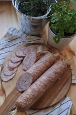 Kiełbasa bankietowa z udźca indyka 132Kiełbasa bankietowa z udźca indyka Kiełbasa bankietowa to zdrowa , domowa alternatywa dla komercyjnych wędlin , zawierających 50-60 % mięsa . Ta kiełbasa ma go 100 % i jest zrobiona dla bliskich z uczuciem i uczciwością . Nie ma nic piękniejszego niż obdarowanie bliskich zdrowiem . Warto więc wrócić do wyrobu własnych wędlin , choćby w niewielkim procencie . Uwierzcie , że to zaprocentuje lepszym zdrowiem i smakiem . Kiełbasa(...)relaksujące zajęcie .. Cenne szczególnie w dzisiejszym zwariowanym zabieganym świecie .., taki mały powrót do przeszłości , kiedy świat był jeszcze realny , zdrowy i naturalny…. składniki : 1,5 kg udźca z indyka bez kości i skóry 0,5 kg świeżego , chudego boczku wieprzowego bez skóry 2 łyżki ostrej mielonej papryki 2 łyżki granulowanego czosnku 1 łyżka mielonej gorczycy białej 1 łyżeczka siekanych