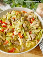 Młoda kapusta duszona z mięsem, papryką i pieczarkami 43Młoda kapusta duszona z mięsem, papryką i pieczarkami to pyszne, aromatyczne danie, które doskonale sprawdzi się na obiad w sezonie wiosenno-letnim. Łączy w sobie soczyste