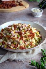 Risotto z kiełbasą i papryką 182Risotto to ekspresowy obiad, szybko się go przygotowuje i jest bardzo sycące. Dzisiaj zapraszam na kolorowe, pełne smaku i aromatu risotto z papryką oraz kiełbasą. Tajemnicą smacznego risotto jest przygotowanie ryżu, doskonale smakuje jeżeli przesmażymy go na masełku do uzyskania perłowego koloru i zalanie ulubionym bulionem na którym ugotujemy ryż. Risotto z kiełbasą i papryką SKŁADNIKI(...)ryżu risotto 500 ml bulionu warzywnego 1 mała papryka czerwona 1 mała papryka zielona 1 cebula biała 200 g kiełbasy podwawelskiej olej szczypiorek sól pieprz 1 łyżka masła PRZYGOTOWANIE: Na patelni roztapiamy masło dodajemy ryż i przesmażamy, aż ryż będzie perłowy wówczas zalewamy 2 szklankami bulionu warzywnego i gotujemy ryż do całkowitego odparowania bulionu. Cebulę obieramy, kroimy w kosteczkę, papryki