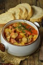 Chłopski garnek z fasolą i wędliną 210przygotowania tej potrawy wykorzystałam resztki wędlin, które zalegały mi w lodówce. Wyszła pyszna, sycąca potrawa, idealna na obiad jednodaniowy. SKŁADNIKI: 300g fasoli białej perłowej, 400g żeberek wieprzowych, 250g kiełbasy cienkiej, 250g szynki wędzonej, 1 cebula, 1 marchewka, 1/2 pietruszki, 3 liście laurowe, 4 ziarna ziela angielskiego, 1/2 łyżki kminku, 1 łyżka przyprawy uniwersalnej, 2 łyżeczki papryki ostrej mielonej, 2 łyżeczki(...)Wlewam 2 litry wody. Gotuję na małym ogniu godzinę. 2. Marchewkę i pietruszkę kroję w plasterki. Dodaję do wywaru. Cebulę drobno siekam, szklę na oliwie i dodaję do fasoli. Kiełbasę kroję w plasterki, a szynkę w kostkę. Z wywaru wyjmuję żeberka i kroję je w kostkę. Kiełbasę, szynkę oraz żeberka podsmażam na oliwie i dodaję do fasoli. Gotuję 20 minut
