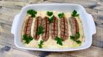 Biała kiełbasa zapiekana w sosie majonezowo – chrzanowym. 110Przepis na białą kiełbasę zapiekaną w lekko pikantnym sosie majonezowo – chrzanowym. Taką kiełbasę możecie podać na śniadanie Wielkanocne. Sprawdzi się również jako danie obiadowe, możecie podać ją z pieczywem lub ziemniakami. Ilość chrzanu dodajcie wg uznania, jeśli wolicie bardziej pikantne wtedy dodajcie więcej chrzanu. (adsbygoogle = window.adsbygoogle || []).push({}); Drukuj Biała kiełbasa zapiekana w sosie majonezowo – chrzanowym Składniki(...)białej kiełbasy surowej 1 duża cebula 200 ml mleka 1 łyżka mąki pszennej 1 łyżka masła klarowanego lub oleju 1 łyżka chrzanu 2-3 łyżki majonezu sól, pieprz do smaku kila gałązek tymianku lub 0,5 łyżeczki suszonego 1 łyżka posiekanej bazylii Instrukcje