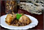 Pałki z grzybami leśnymi 232Składniki: 1 kg pałek z kurczaka 30 dkg odgotowanych podgrzybków 1 cebula 1 łyżka czubrycy czerwonej 1 łyżka suszonego czosnku niedźwiedziego 2 łyżki maggi liść laurowy