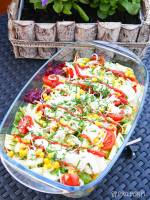 Pieczony kurczak z papryką i pieczarkami 181papryką ostrą i słodką, czosnkiem oraz solą. Dodajemy olej i nacieramy nim i przyprawami mięso. Odstawiamy do lodówki na kilka godzin (najlepiej na noc). Kurczaka razem z marynatą wkładamy do żaroodpornego naczynia i przykrywamy przykrywką. Pieczemy w piekarniku nagrzanym do 180°C przez 40 minut. Po upływie tego czasu wyjmujemy naczynie z piekarnika. Na mięsie układamy pokrojoną na średniej(...)wielkości kawałki paprykę, pieczarki oraz poszatkowaną w piórka cebulę (warzywa powinny przykrywać kawałki kurczaka). Wierzch oprószamy solą ziołową. Wkładamy z powrotem do piekarnika i pieczemy przez kolejne 20 minut, tym razem już bez przykrycia. Podajemy z ryżem lub pieczywem