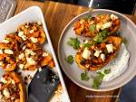 Bataty pieczone z pieczarkami i kurczakiem 120W moim domu uwielbiamy bataty a już dzieci to szczególnie, często pieczemy je na różne sposoby, tym razem padło na farsz z pieczarek, suszonych pomidorów i