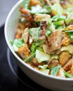 Prosta sałatka z kurczakiem i grzankami a’la hamburger 90Aromatyczne filety z kurczaka w przyprawie gyros, chrupiące grzanki, zielona sałata lodowa, ser żółty, a do tego pyszny sos z dodatkiem posiekanej cebulki i słonych ogórków