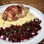 Przepiórki pieczone z botwinką podane 103Przepiórki owinięte boczkiem i nasmarowane masłem, a następnie pieczone na chrupko. PRZEPIÓRKI PIECZONE SKŁADNIKI sześć sztuk przepiórek; 6 dużych plastrów pancetty lub surowego wędzonego boczku; 1