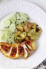 Młode ziemniaczki z piersią z kurczaka marynowanej w kurkumie i oregano, z mizerią z ogórków 153Młode ziemniaczki z masełkiem i koperkiem. Do tego soczysta pierś z kurczaka, marynowana w kurkumie i oregano oraz letnia mizeria z ogórków gruntowych. Cóż można chcieć