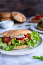 Pita z udkami kurczaka i tzatzikami 76Domowa pita wypełniona kawałkami mięsa z nogi kurczaka, listkiem sałaty, pomidorkami i sosem tzatziki. Bardzo delikatna bułka i ciekawy farsz. Moim bliskim ta propozycja bardzo przypadła