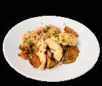 Zapiekanka makaronowa z wędzonym kurczakiem, brokułem i groszkiem 262odrobinę oleju rzepakowego. Makaron gotować nieco krócej niż podaje opakowanie. Odcedzić z wody i przełożyć do miski z brokułem. Do tej samej miski obrać mięso z wędzonych udek z kurczaka, rozdrabniając je na mniejsze kawałki. Następnie wsypać odcedzony z zalewy groszek, wlać śmietanę 30%, wymieszać i doprawić solą, świeżo mielonym pieprzem i ziołami prowansalskimi. Duże naczynie żaroodporne wysmarować masłem(...)masa zacznie gęstnieć, wsypać ser i doprawić solą, świeżo mielonym pieprzem i gałką muszkatołową. Beszamel serowy przelać na wierzch zapiekanki, nałożyć pokrywę naczynia żaroodpornego i włożyć do piekarnika. Piec około 40 minut. Podawać posypane delikatnie natką pietruszki