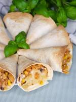 Zapiekane rożki z tortilli 2131Zapiekane rożki z tortilli to kolejna smaczne propozycja na nietuzinkowy posiłek. Takie rożki z tortilli mogą posłużyć jako danie obiadowe, gdyż są bardzo sycące, ale także