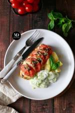 Pieczone piersi z kurczaka z mozzarellą i pomidorami 137Zapiekane piersi z kurczaka z pomidorami i mozzarellą . Piersi z kurczaka nacinamy nożem, w każde nacięcie wkładamy plaster pomidora i plaster mozzarelli. Wszystko skrapiamy oliwą wymieszaną