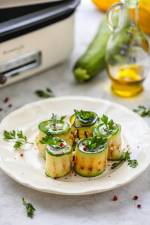 Gotuj z Prezesempłatkami owsianymi Placki cukiniowe z czarnuszką Szaszłyki z łososia na cukiniowym spaghetti Placki z cukinii z serem Zupa-krem z cukinii Leczo w słoikach na zimę Cukinie faszerowane kaszą kuskus i kurczakiem Roladki z cukinii z serkiem Składniki: 2 młode cukinie (po ok. 25cm długości) 200g serka śmietankowego 100g sera typu feta (miękkiego) czerwony pieprz (lub czarny świeżo mielony