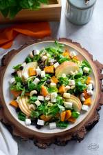 Na-talerzu.plrazem wykorzystałam jednego ziemniaka, ale można dać dwa bataty, będzie jeszcze lepiej i nieco bardziej treściwie. A jeżeli lubisz sałatki z pieczonym batatem, zobacz też przepis na sałatkę z kuskusem, batatem i serem halloumi . na 3-4 porcje: 1-2 bataty 1 op. roszponki 1 jabłko 1-2 garście suszonej żurawiny 1-2 garście orzechów (pekan, laskowe, włoskie lub nerkowce