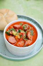 Podstawy Gotowaniadodatkiem kiełbasy. Zachęcam do skorzystania z innych przepisów z sezonowymi warzywami: 5 pomysłów na gulasz Ciecierzyca z chorizo w pomidorach Cukinia zapiekana z pomidorami i mozzarellą Cukinia faszerowana kuskusem z suszonymi pomidorami Cukinia z papryką i czosnkiem w pomidorach Leczo z kiełbasą i cukinią / 2 porcje Składniki: 1 czerwona papryka 2 pomidory malinowe 1/3 średniej cukinii 1/3 kiełbasy toruńskiej