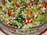 To co kochamSałatka, gdzie kasza kuskus została zastąpiona startym kalafiorem. Jeśli nie lubicie surowego kalafiora, to można go zetrzeć na tarce i zalać wrzątkiem na 2-3 minuty. Do tej sałatki można dodać posiekane liście mięty. Smakuje tak jak wygląda. Jest pyszna! Składniki: – 1/2 kalafiora – po 1/2 papryki w trzech kolorach – 4 pomidorki – 1 średni ogórek zielony