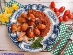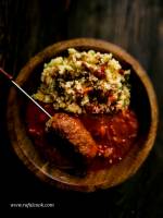 upichconaprzykryciem. Podczas pieczenia co jakiś czas mięso polewać powstałym sosem, w razie gdyby było go za mało uzupełniamy pozostałą wodą. Mięso podać ze świeżymi warzywami, granetem, ziołami i kuskusem. Smacznego