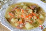 RafalCookgęsty i kolorowy od aromatycznych warzyw. Gotuję go z różnymi gatunkami kaszy (żeby nie było nudy): a to pęczakiem, a to jaglaną, bulgurem, ale faworytem jest oczywiście mój ukochany kuskus perłowy. Składniki na duży gar: kawałek wędzonego żeberka porcja rosołowa z kurczaka wędzona kość schabowa liść laurowy ziele angielskie ok 150 g kaszy kuskus perłowy (tak 3/4 szklanki) 2 marchewki