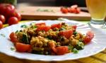 VioletoweKucharzenieSkładniki: kuskus 1 szklanka, gorąca woda 1 szklanka, jajka ugotowane na twardo 3 sztuki, pomidory 2 sztuki, szczypiorek 1/2 pęczka, koperek 1/2 pęczka, serek śmietankowy 140 gram, sól ziołowa - do smaku, pieprz czarny mielony 1/2 łyżeczki w misce kaszę kuskus zalać gorącą wodą, przykryć na 10 minut dodać pkorojone pomidory, jajka, posiekany szczypiorek, koperek do smaku posolić solą ziołową, dodać
