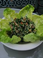 Miód i pieprzTabbouleh libańska sałatka z bobem, quinoą i ziołami. Jest to odmiana arabskiej, dokładnie libańskiej, sałatki z warzyw z kaszą kuskus. Jednak zamiast kaszy kuskus można też użyć komosy ryżowej (quinoa), bulgur lub naszej kaszy jaglanej. Do tego świeże warzywa, a przede wszystkim świeże zioła – mięta, bazylia, pietruszka; dużo pomidorów, trochę cebuli i czosnku, czasem papryka. Wszystko podlane sokiem
