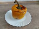 Moja smaczna kuchniapapryki, 1 cebula, 1 ząbek czosnku, 100 – 150 g bekonu lub boczku wędzonego, 2 pomidory, 4 pełne łyżki kaszy kuskus, tłuszcz do posmarowania papryki Cebulę pokroić w kostkę. Czosnek posiekać. Pomidory sparzyć, zdjąć skórkę, pokroić w niezbyt drobną kostkę. Bekon pokroić w niewielką kostkę, podsmażyć (w rondlu z grubym dnem) wytapiając tłuszcz. Jeżeli użyjemy bekon, może wytopić się zbyt mało(...)tłuszczu, wówczas należy dodać olej, tłuszcz gęsi lub oliwę. Do bekonu/boczku dodać cebulę i czosnek, poddusić. Następnie dodać pomidory, dusić razem około 1 minuty. Zdjąć z ognia. Dodać kuskus, wymieszać, i zalać gotującą się wodą na pół centymetra powyżej poziomu kaszy. Przykryć i odstawić. Papryki umyć, odciąć wierzch z ogonkiem (zachować), wyjąć pestki. Wypełnić papryki farszem, przykryć zachowanymi wierzchami