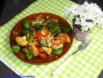 Roślinna - blog wegańskipodsmażyć jedną połówkę piersi z kurczaka pokrojoną w kostkę, a następnie dodać do niej warzywa i postępować zgodnie z przepisem poniżej. Składniki na 1 porcję jako danie solo: 90g kuskusu kilka pieczarek garść mrożonej papryki lub 1 średnia świeża (u mnie czerwona) garść mrożonego szpinaku w liściach (może być też świeży baby) 1 marchewka starta na tarce o grubych oczkach(...)passaty (przecieru) pomidorowej 1 ząbek czosnku 1 łyżka oleju 1 łyżeczka przyprawy do gyrosa sól pieprz Przygotowanie: Kuskus przygotować wg instrukcji na opakowaniu Pieczarki pokroić na półtalarki, ząbek czosnku posiekać, dodać resztę warzyw (bez szpinaku) i smażyć do miękkości na odrobinie oleju. Następnie dodać szpinak i passatę, doprawić solą, pieprzem i przyprawą gyros. Smacznego, Anulla