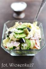 Moja smaczna kuchniaSkładniki: 250g tortellini z mięsem 200g szynki drobiowej 1 ogórek świeży 1 papryka czerwona 2 pomidory 2 łyżki majonezu lekkiego Sól, pieprz Przepis: Tortellini gotujemy