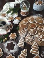 Pierniczki korzenne na mące orkiszowej/Wigilijna kapusta z żółtym grochem 195Pieczenie pierniczków to znana tradycja bożonarodzeniowa. U mnie również znana i stosowana. Dawniej lepiłam i dekorowałam aniołki z masy solnej, ale trudno powiedzieć żeby dało się je degustować (choć mój pierwszy pupil, pies Rudi za nimi przepadał, do tego stopnia, że potrafił gotowe aniołki ściągać z choinki). W natłoku codziennego życia, pracy i obowiązków domowych dobrze jest zaplanować jeden wieczór(...)którym skupimy się na wyrabianiu ciasta, wykrawaniu foremek, pieczeniu i dekorowaniu gotowych pierniczków. Wiem, że ciasto powinno przeleżeć określony okres czasu zanim weźmiemy się za dalszą pracę, ale ja już któryś rok z rzędu z powodzeniem po 15 minutach zaczynam dalsza zabawę z wykrawaniem ciasta. Zwykle zaczynam po pracy, koło 17.00. Mieszam 25g masła z 300 g miodu