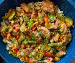 Pieczona polędwiczka z warzywami i makaronem po chińsku 257Składniki: 2 polędwiczki wieprzowe, umyte i osuszone oraz pozbawione błon 3 łyżki startego imbiru 4 ząbki posiekanego czosnku 10 łyżek sosu sojowego 4 łyżki miodu sól pieprz łyżka soku z limonki opakowanie makaronu Wok Noodles olej sezamowy jedna marchew, pokrojona w słupki 2 papryki, pokrojone w paski brokuł, podzielony na różyczki 250 gram groszku cukrowego garść posiekanej dymki pół(...)szklanki soku z puszki ananasa Zaczynamy od przygotowania polędwiczek. Robimy marynatę z: dwóch łyżek startego imbiru, dwóch posiekanych ząbków czosnku, sześciu łyżek sosu sojowego, czterech łyżek miodu, soku z limonki, soli i pieprzu. Umieszczamy w marynacie polędwiczki i wkładamy do lodówki na minimum godzinę (u mnie spędziły w lodówce 6 godzin i ich smak był wyśmienity, ponadto były bardzo soczyste