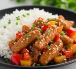 Wieprzowina po chińsku 64Wieprzowina po chińsku To danie łączy w sobie delikatność polędwiczki wieprzowej z bogactwem azjatyckich smaków. Sos jest gęsty, aromatyczny o wyrazistym smaku słodko-słonym z nutą