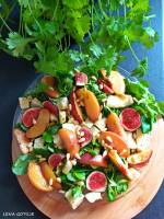 Sałatka z figami, brzoskwiniami i serem hallumi 34Pyszna sałatka z roszponką, figami, słodkimi brzoskwiniami oraz serem hallumi i lekko kwaśnym dresingiem z limonką. Bardzo dobrze smakuje podana z ciepłym serem i brzoskwiniami