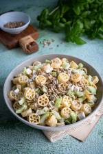 Sałatka makaronowa z paluszkami krabowymi 238Sałatka makaronowa, to taka sałatka, która jest i sycąca i smaczna zarazem. Sałatka makaronowa z paluszkami krabowymi Do tego typu sałatki można dodać prawie wszystko. Możemy użyć różnych rodzajów makaronów. Z makaronem możemy wymieszać kurczaka, łososia, tuńczyka, krewetki, paluszki krabowe. Możemy także zrobic sałatkę tylko i wyłącznie warzywaną, używając kukurydzy, papryki, ogórka czy pomidora. Przepisów na sałatkę makaronową jest naprawdę(...)wiele. Mój przepis dla Was to sałatka z dodatkiem paluszków krabowych. Niesamowicie lekka i kremowa w smaku. Jeśli zdecydujecie się na wypróbowanie tego przepisu, zachęcam Was do dzielenia się zdjęciami w zakładce Komentarz. Smacznego Składniki. 1 szklanka makaronu świderki + 1 łyżka soli 1 awokado 1/2 puszki kukurydzy 25 dkg paluszków krabowych pęczek koperku 1/2 ogórka sałatkowego 3/4 łyżeczki soli biały