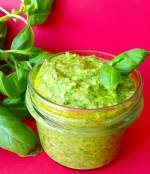 Pesto pietruszkowo-bazyliowe 38Pesto to tradycyjny włoski sos pochodzący z Genui, którego głównym składnikiem jest bazylia. Tradycyjnie wytwarzany jest w marmurowych moździerzach z oliwy, bazylii, parmezanu (lub innego drobno