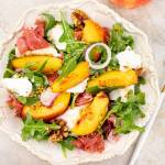 Sałatka z brzoskwiniami 20Sałatka z brzoskwinią , szynką parmeńską i burratą lub mozzarellą, to kwintesencja lata i młodej jesieni. Przepis sprawdzi się zarówno na wyjątkowe okazje, jak i na szybką