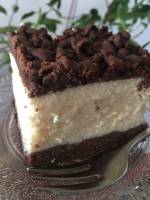 Wykwintny sernik czekoladowy z karmelizowanymi pistacjami i orzechami 159kakao. Na sam koniec dodać stopioną wcześniej w kąpieli wodnej czekoladę. Zmiksować na najniższych obrotach miksera. Masę przełożyć do małej tortownicy wyłożonej papierem do pieczenia. Piec w 160C 1h. Wystudzić. Wierzch: na patelni stopić masło, wrzucić posiekane na kawałki pistacje i orzechy włoskie. Po chwili dolać golden syrup. Podsmażyć do lekkiego zrumienienia się orzeszków. Ciepłą (!) polewą udekorować wystudzony sernik