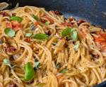Spaghetti z Mulami z Chili, Czosnkiem i Pietruszką 193Spaghetti z mulami.. Od zawsze chciałam spróbować przyrządzić mule razem z muszlami. Wydawało mi się takie ekscytujące jak w garnku muszle obijają się o ścianki i pod wpływem ciepła otwierają się niczym rozkwitające kwiaty. Więc kiedy wpadłam na świeże mule w sklepie nie było opcji, że ich nie kupię. Nie powstrzymał mnie mój przyjaciel Leń. Bo kiedy wdrapałam(...)ponownie ubrałam buty i powędrowałam do sklepu. Zaczęłam przygotowania do obiadu, a w między czasie sms`owałam z synem. JA: Zgadnij co dziś na obiad? ALEX: Co? JA: Spaghetti z mulami ALEX: Z czym? JA: Z mulami! ALEX: A co to? JA: No te małże w czarnych muszlach. ALEX: Ostrygi? JA: Nie! Małże! ALEX: Aha JA: Będziesz jadł