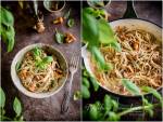 Spaghetti z cukinią, Long Phung 228masło są w tym daniu konieczne – dzięki nim wchłaniane są zawarte w cukinii witaminy A i K ( rozpuszczalne w tłuszczach). Porcja dla 2-3 osób. Składniki: 250g makaronu spaghetti 3-4 łyżki oliwy 4-5 łyżek masła 3 małe cukinie lub 2 większe sól, pieprz opcjonalnie: wędzona papryka lub ulubione zioła Ugotuj makaron wg instrukcji na opakowaniu, dodaj oliwę(...)Później tofu w sosie curry (podawane w żeliwnym garnku z miseczką białego ryżu) – bardzo duża porcja. Można pysznie i wegetariańsko (a nawet wegańsko) w Rzeszowie? A pewnie, że tak! Spaghetti with zucchini It’s been my favourite dinner recently – delicious, quick to make and extremely easy. Got the idea from Aśka – thanks:). Olive oil or butter are necessary here ‘cause
