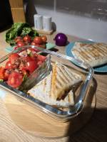 Cooking Monsterkurczaka mix sałat pomidor czerwony i żółty ogórek papryka czerwona czerwona cebula sos kremowy z Lidla marynata do kurczaka: 1 łyżeczka curry 1/3 łyżeczki soli 1/2 łyżeczki pieprzu ziołowego 1/3 łyżeczki papryki 1 łyżka oleju kokosowego Filet z kurczaka kroimy na paski i mieszamy ze składnikami na marynatę. Odstawiamy na 15 minut, a następnie smażymy na patelni. Placki tortilli