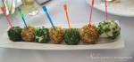 Kulki serowe z winogronami 158sera białego tłustego • 30 dkg sera z niebieską pleśnią typu rokpol • sól, pieprz do smaku • 1/2 szklanki mielonych orzechów włoskich • 1/2 szklanki płatków migdałowych • po kilkanaście winogron ciemnych i jasnych • czipsy ziemniaczane Wykonanie: • Ser biały zmiksować z pleśniowym na gładką masę, przyprawić. • Na łyżeczkę masy serowej wcisnąć winogrono i oblepić serem. Masa(...)jest dość gęsta więc ładnie się oblepia. • Połowę masy zrobić z ciemnymi winogronami i obtoczyć kulki w mielonych orzechach. • Drugą połowę zrobić z jasnymi winogronami i obtoczyć w płatkach migdałowych. • Gotowe kulki położyć na czipsach ziemniaczanych