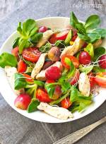 Sałatka z kurczakiem i winogornem 145Sałatka z kurczakiem, pomidorkami, słodkim winogronem, lekko pikantnymi kiełkami i świeżą roszponką Składniki: (na dwie porcje): 3 duże garści roszponki, 250 g fileta z kurczaka