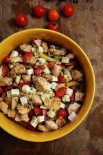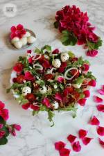 Włoska sałatka z kulkami mozzarelli i płatkami pelargonii 275Lekka włoska sałatka z mini mozzarellą, orzechami włoskimi, winogronami i pomidorami koktajlowymi, to smaczne połączenie warzyw, owoców i sera. Wszystko to zatopione w różnych odcieniach zieleni