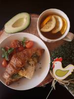 Croissant z awokado i jajkiem 165Kolejna szybka propozycja na śniadanie gdzie możemy wykorzystać gotowe rogaliki francuskie. Jeśli do tego ładnie je podamy to mogą być częścią Wielkanocnego śniadania. Polecam! Składniki