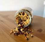 Granola z pestkami dyni, suszoną żurawiną i wiórkami kokosowymi 190Składniki: 3 szklanki płatków owsianych górskich; 1 szklanka suszonej żurawiny; 1/2 szklanki pestek dyni; 1/2 szklanki wiórków kokosowych; 1/2 łyżeczki soli; 1/2 szklanki syropu klonowego (lub