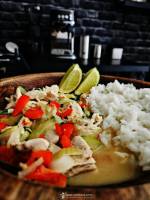 Moja Delicjasojowym i jajkiem z woka to przepyszna i bardzo esencjonalna zupa (16 zł) massaman curry z kurczakiem i ryżem jaśminowym (28 zł). Uwielbiam wszelkie rodzaje curry, ta pozycja bardzo mi smakowała. Curry gęste, pikantne i pełne aromatów, a kurczak soczysty. krewetki z ananasem i imbirem oraz tajską bazylią (29 zł) były idealne, soczyste, aromatyczne, wraz z ananasem tworzyły